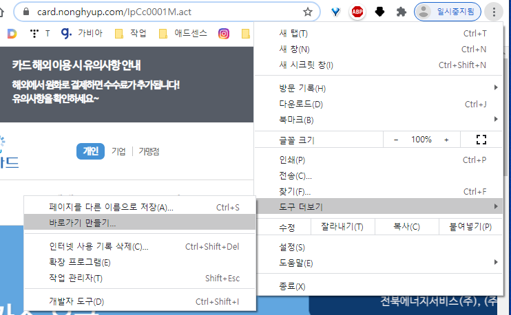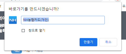 두번째 바탕화면에 농협카드 바로가기를 만드는 방법은 크롬을 통해 농협카드 홈페이지를 들어가신 후 오른쪽 위에 있는 메뉴버튼을 눌러 도구 더보기를 찾아 클릭해 주시면 바로가기 만들기가 뜹니다. 바로가기 만들기를 클릭해주시면 바로가기를 만드시겠습니까? 가 뜨고 만들기를 누르면 바탕화면에 바로가기가 생성됩니다.