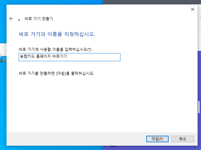 첫번째 방법은 농협카드 홈페이지 주소를 안다면 추천드리는 방법으로 바탕화면 빈곳에 마우스 오른쪽 버튼을 클릭한 후 새로만들기를 누르고 바로가기를 클릭해주시면 바로가기 만들기 팝업창이 뜹니다. 이때 황목위치입력에 농협카드 홈페이지 주소를 입력해주시고 다음을 눌러주신 후 원하시는 이름을 입력하시고 마침을 눌러 주시면 바로가기가 바탕화면에 생성됩니다.