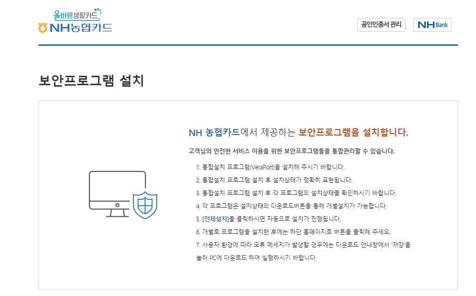 농협카드 홈페이지를 처음들어가시게 되면 보안 프로그램을 다운받으라는 안내가 먼저 뜹니다. 필수로 다운받아야되는 보안 프로그램을 다운받으셔야 홈페이지 이용이 가능하시니 안전을 위해서라도 다운을 받아주시면 됩니다.