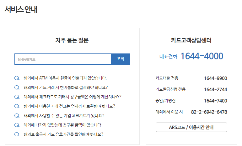 만약 오른쪽에 있는 서비스 메뉴에서도 찾기가 어려우시다면 농협카드 고객 상담센터 1644-4000 로 전화를 하셔서 문의를 하시는 방법도 있습니다. 아래는 농협인터넷뱅킹바로가기와 국민은행 홈페이지바로가기 농협공판장인터넷 통합거래시스템실시간 가격확인 바로가기 링크입니다. 필요하신 정보가 있으시면 들어가셔서 참고해 보시면 될 것같습니다. 감사합니다.