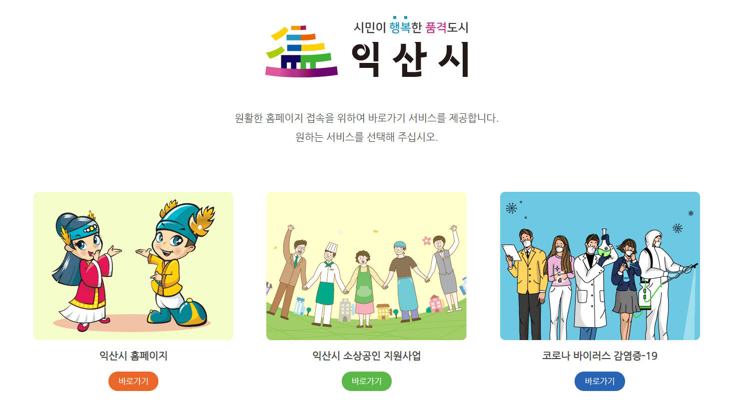 홈페이지를 클릭하시면 익산시에서 제공하는 세가지 서비스 익산시 홈페이지 바로가기와 익산시 소상공인 지원사업, 코로나 바이러스 감염증-19 중에 클릭하실 수있습니다. 저희가 원하는건 익산시 홈페이지 바로가기이니 제일 첫번째에 보이는 익산시 홈페이지 바로가기를 클릭해서 익산시 홈페이지에 접속해 보도록 하겠습니다.