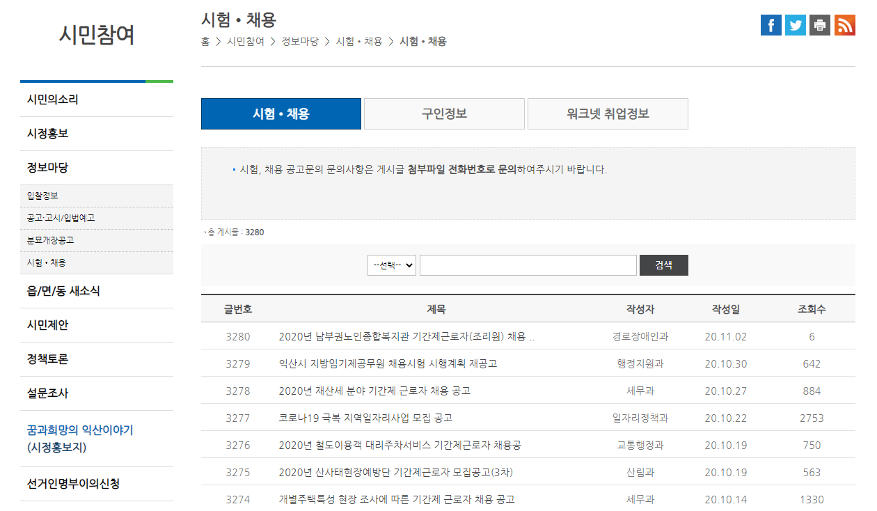 또한 오른쪽에 있는 시험/채용 버튼을 누르시면 시험/채용 공고와 구인정보, 워크넷 취업정보등 다양한 서비스도 준비되어 있습니다. 익산시청에서도 일자리 정보를 확인할 수있다니 정말 괜찮은것 같습니다.