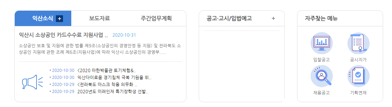 또 익산 홈페이지 아래쪽으로 내려보시면 익산소식에 대한 글도 보실 수있고 시민들이 자주 찾는 메뉴도 따로 나와있습니다. 입찰공고와 공시지가, 채용공고, 기획연재를 가장 많이 찾는 것같습니다.