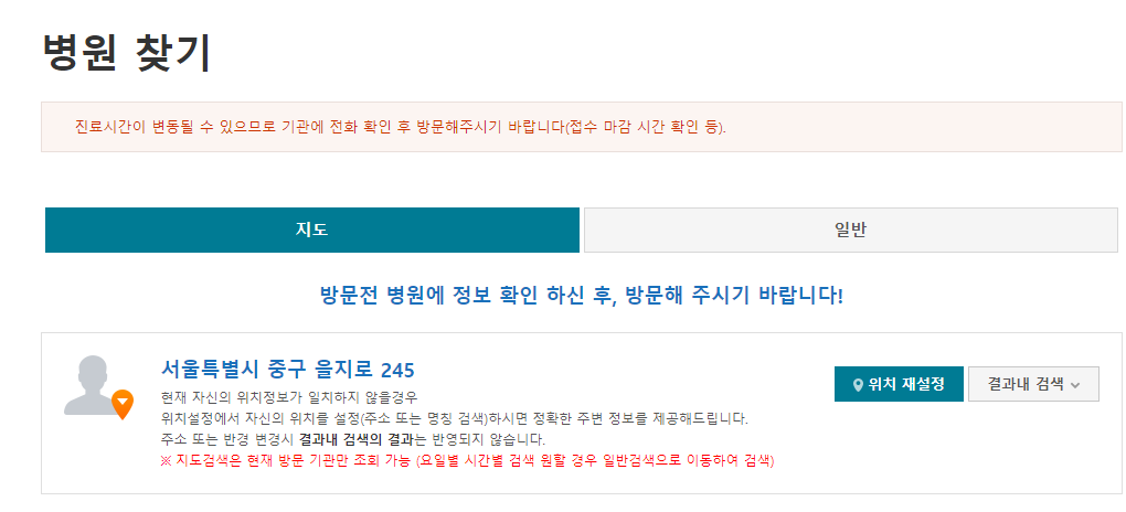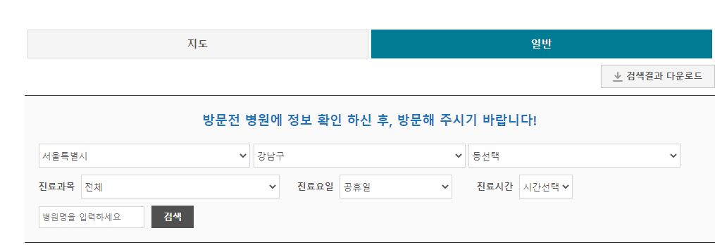 병원찾기를 클릭하시면 지도로 찾는 방법과 일반으로 찾는 두가지 방법이 있습니다. 저희가 원하는 병원찾기는 공휴일병원찾기이기 때문에 지도가 아닌 일반을 클릭해서 찾아 보겠습니다. 지도에서 검색하시면 현재 검색하는 시점에 진료가능한 병원이 나오기 때문에 공휴일에 검색하시는 분들은 지도로 검색하셔도 됩니다.