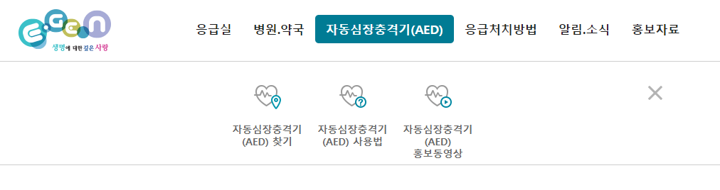 응급의료포털 사이트 위쪽을 보시면 응글실, 병원/약국, 다음에 자동심장충격기라는 메뉴가있습니다. 자동심장충격기 메뉴를 클릭하시면 자동심장충격기찾기와 사용법, 홍보동영상을 볼 수있습니다. 자동심장충격기 사용법을 알고계시면 언젠가는 도움이 될 수도있으니 홈페이지에 접속하셔서 홍보동영상을 시청하는 것도 좋을것같습니다.