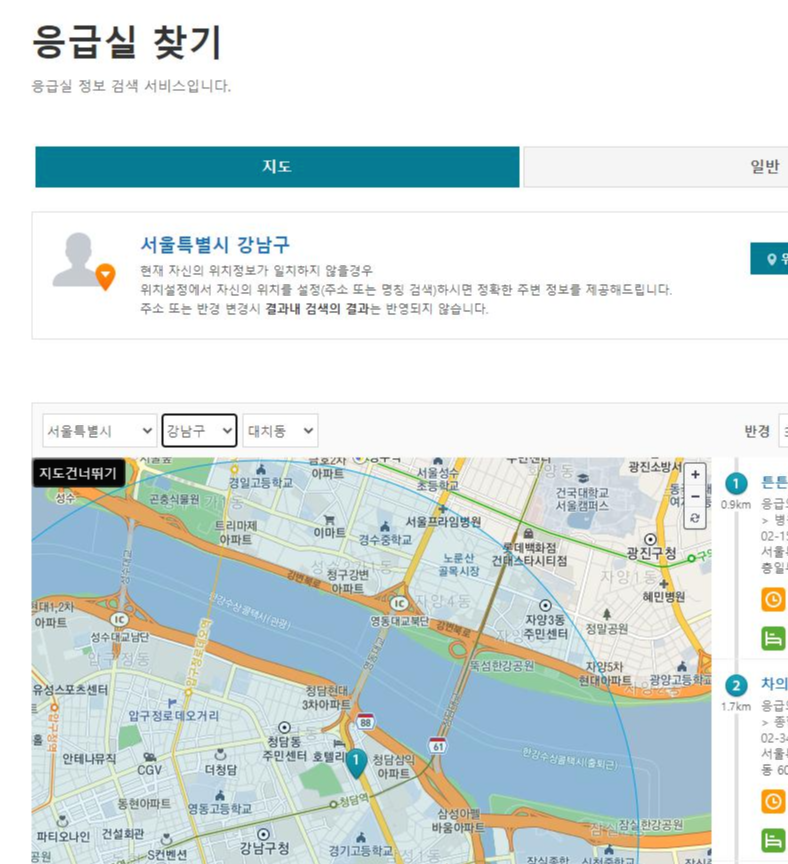 응급의료포털 사이트에는 병원찾기 말고도 약국찾기도 가능하고 병원찾기를 했는데 주변에 공휴일에 문여는 병원이 검색이 안되신다면 응급실찾기를 이용해서 응급실로 바로가시는 것도 추천드립니다. 응급실은 일반으로 검색하시는 것보다 지도로 검색하시면 더 많은 응급실이 검색되시니 지도로 검색하는 방법으로 검색해 보시는게 좋을것 같습니다.
