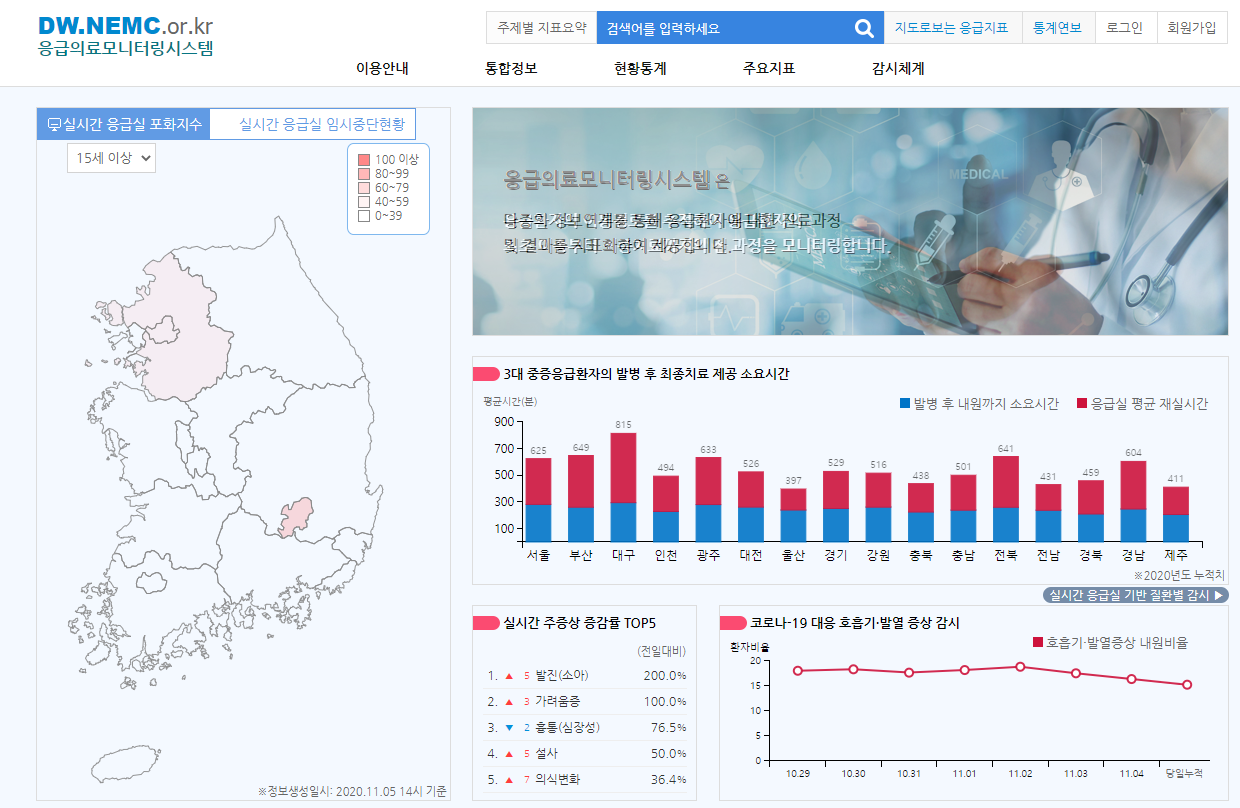 또한 사이트 맨위쪽에 보시면 작은 글씨로 응급의료 모니터링이라고 있습니다. 응급의료 모니터링을 클릭하시면 실시간 응급실 포화지수등 응급의료체계의 가동실태를 파악하여 응급의료 정책의사결정을 지원하는 사이트도 있습니다.