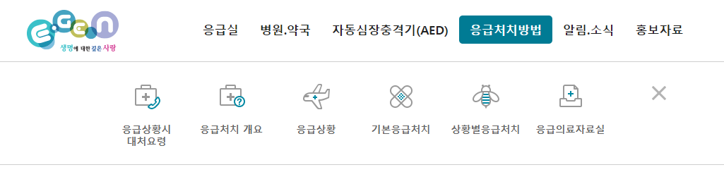 자동심장충격기 메뉴 옆에는 응급처치방법이라는 메뉴가 있습니다. 응급상황시대처요령과 응급처치개요(응급상황시 행동원칙), 여행중 일어날수있는 응급상황, 상황별응급처치, 응급의료자료실등 다양한 응급상황에서 활용할 수있는 응급상황 대처법등을 볼 수있습니다.