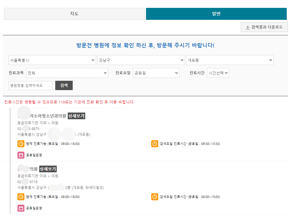 제가 검색한 시점이 공휴일이 아니라서 현재진료가능이 뜨고 그아래에 공휴일 운영이라고 나옵니다. 동까지 설정해서 검색했더니 병원이 두개밖에 뜨지 않았는데요. 차를 이용하실 수있는 상황이고 조금더 멀리가실 수있으시다면 구까지만 설정해서 검색하시면 더 다양한 병원이 나옵니다.