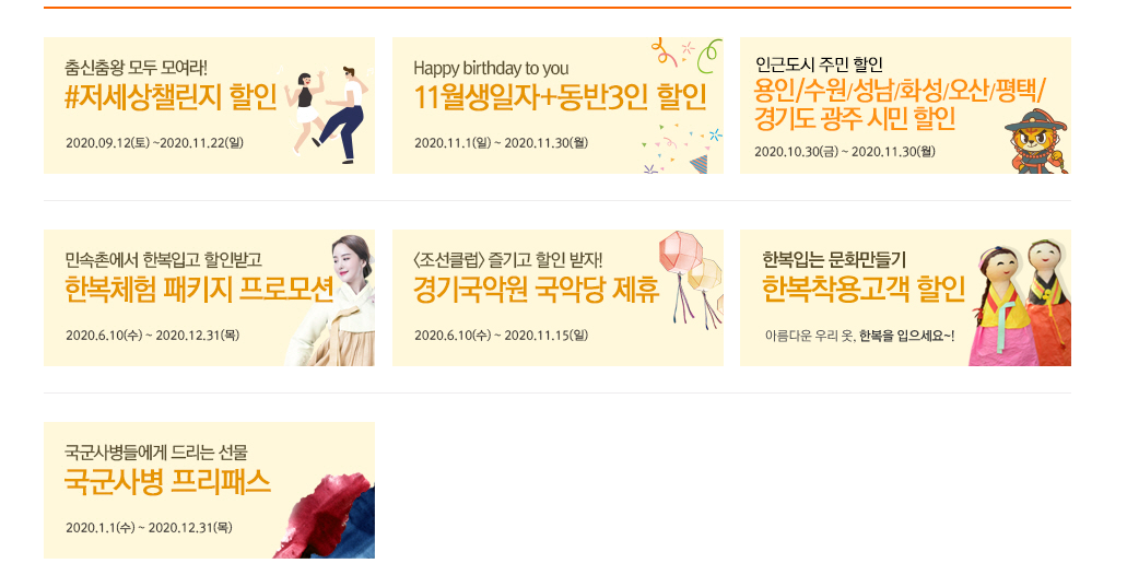 경기 용인시 기흥구 민속촌로90 / 입장권성인 22000원, 자유이용권 30000원 입니다. 이놈아저씨로 유명한 한국민속촌은 다양한 먹거리와 볼거리로 재미가 있는 곳입니다. 비용이 부담되신다면 다양한 할인프로모션과 제휴할인카드를 확인하시면 좋을 것같습니다.www.koreanfolk.co.kr/information/credit_card.asp < 제휴카드할인 링크