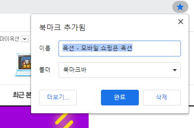 위에 방법도 있지만 옥션홈페이지에 접속하신 후 주소창 맨끝에 보면 별(☆)표시가 있습니다. 별(☆)표시를 클릭하면 바로 북마크에 추가됨이 나오고 완료 버튼을 누르시면 북마크에 옥션바로가기가 추가되면서 별(★)의 색이 변경됩니다.