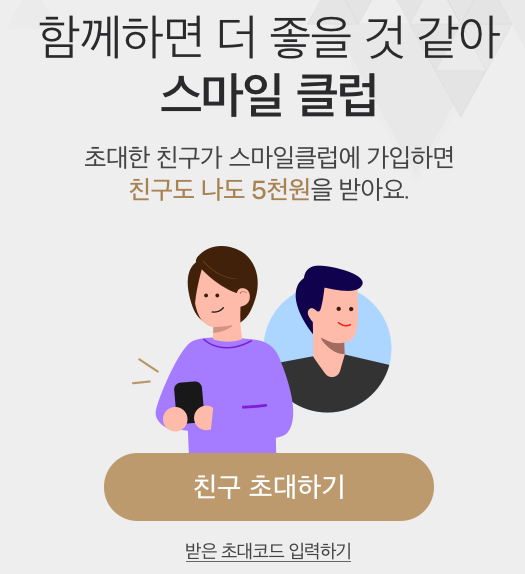 또한 내가 가입한 후 친구에게 초대코드를 보내고 친구도 스마일클럽에 가입하면 친구도 본인도 5천원을 받을 수있고 친구를 가장많이 초대한 초대왕에게는 최대 100만원의 상금도 받을 수있으니, 참고하시면 좋을 것같습니다.