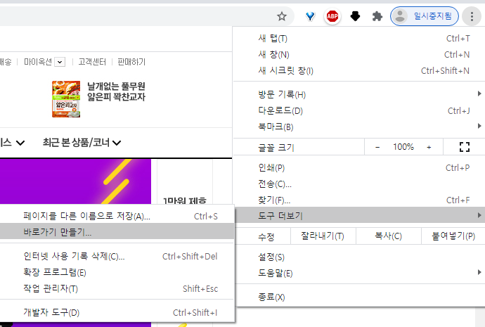 저는 인터넷을 사용할때 크롬을 자주사용하는데요. 크롬으로 옥션 홈페이지에 접속 후에 오른쪽 상단에 메뉴버튼을 클릭 후 도구더보기를 클릭하면 바로가기 만들기가 나옵니다. 바로가기 만들기를 클릭하면 바로가기를 만드시겠습니까?라는 팝업창이 나오는데, 만들기를 누르시면 바탕화면에 바로가기가 생성됩니다.