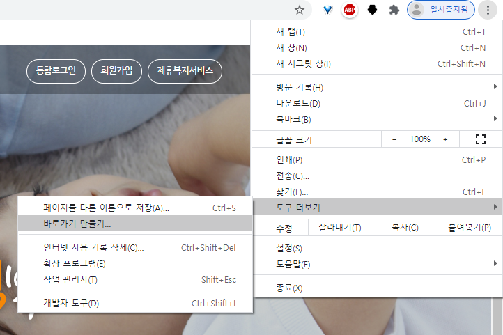 크롬을 이용하시는 분이라면 복지포탈 홈페이지에 접속하신 후 오른쪽 상단에 있는 메뉴버튼을 누르고 도구더보기를 누른 후 바로가기 만들기를 눌러주시면 바탕화면에 복지포탈홈페이지 바로가기를 간단하게 생성하실 수있습니다.