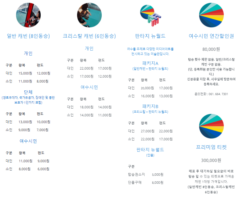 여수하면 밤바다이고 밤바다를 잘 볼 수있는 곳중 한곳인 여수케이블카! 바닥이 투명한가 아닌가로 크리스탈과 일반으로 나뉘고 원하는 왕복티켓을 구매하고 해 쨍쨍할때 타고 돌아올땐 해질때쯤 돌아오면 색다른 풍경을 볼 수있어서 짧지만 강렬한 인상의 케이블카를 타실 수있습니다.(자세한 위치 등은 여수케이블카 홈페이지에서 확인 가능합니다)